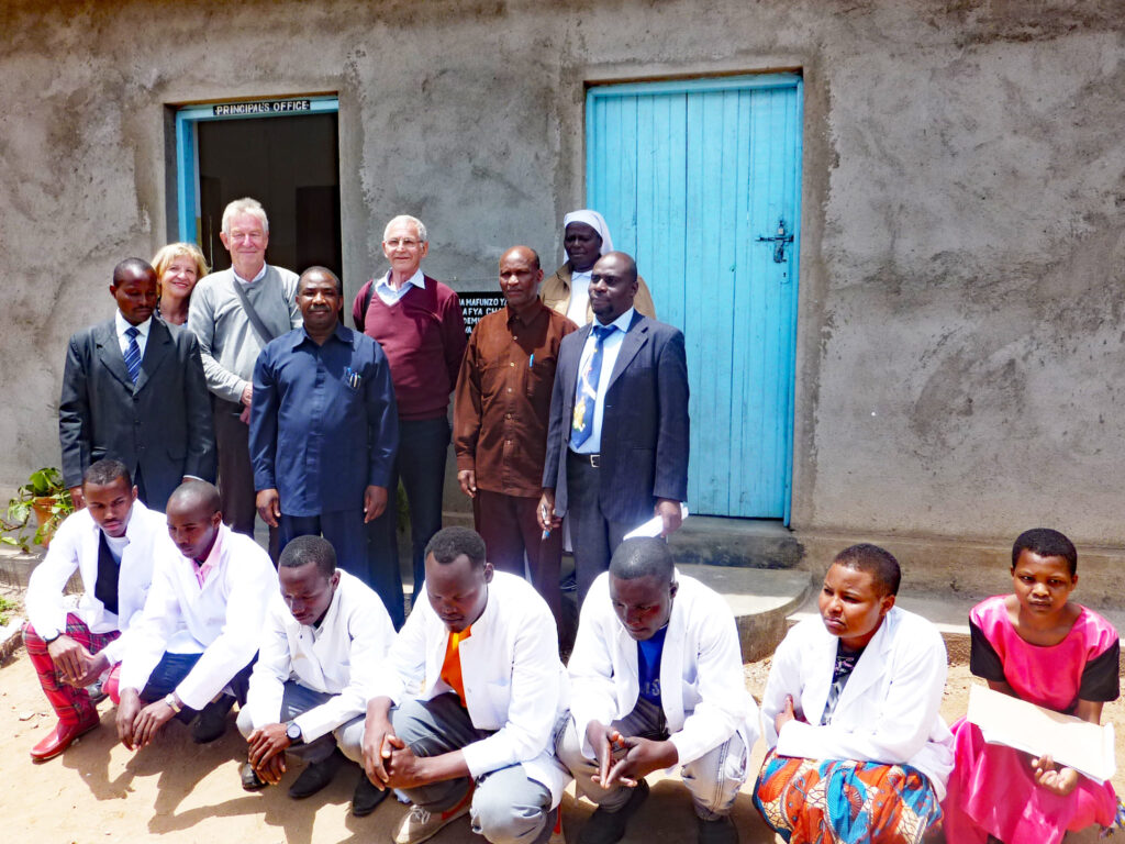 Gruppe im Hintergrund:  Der Regional Medical Officer der Region Manyara, Dr. Uledi (4. von links), die treibende Kraft des Kollegs, Sr. Basilisa Panga, Ärztin und Health Secretary der Diözese Mbulu (2. von rechts), der Principal des Kollegs Jeddy MZungu (1. von rechts) und hinten stehend Uschi und Jürgen Krahl und Rolf Schnee von Kusaidia Afrika.